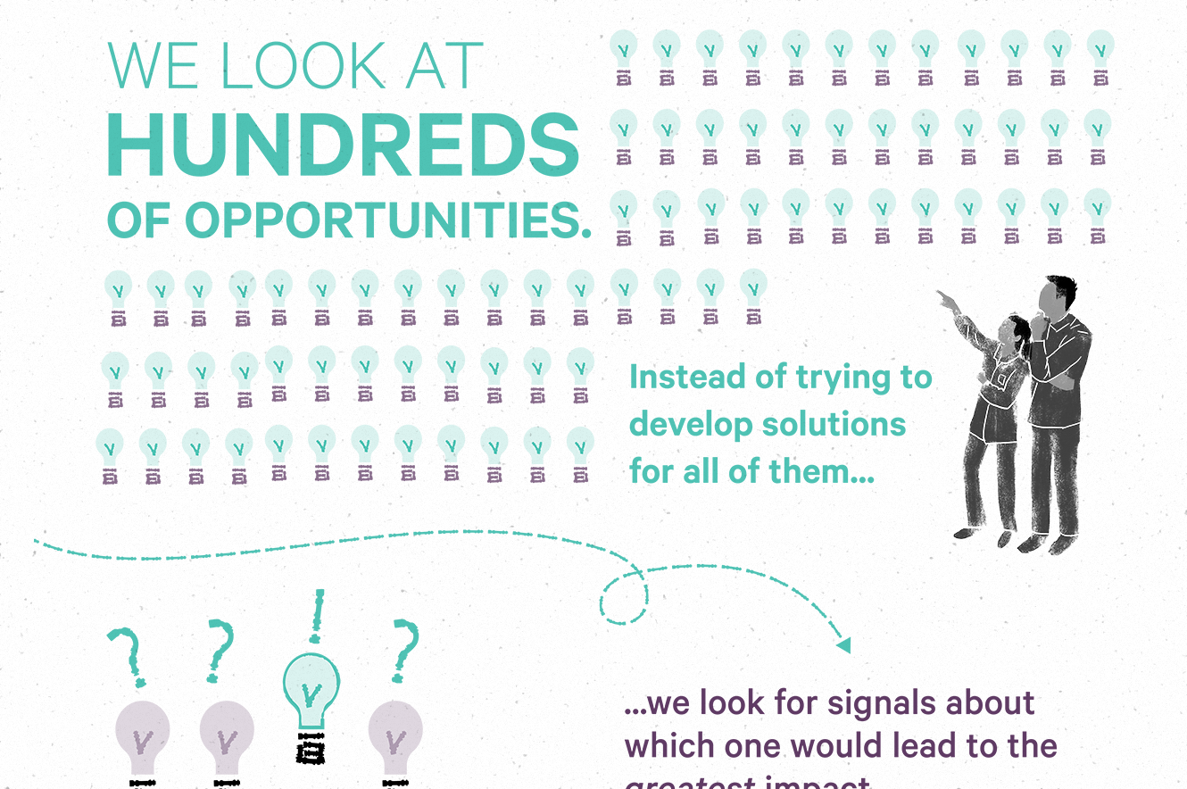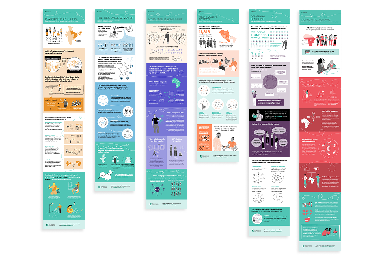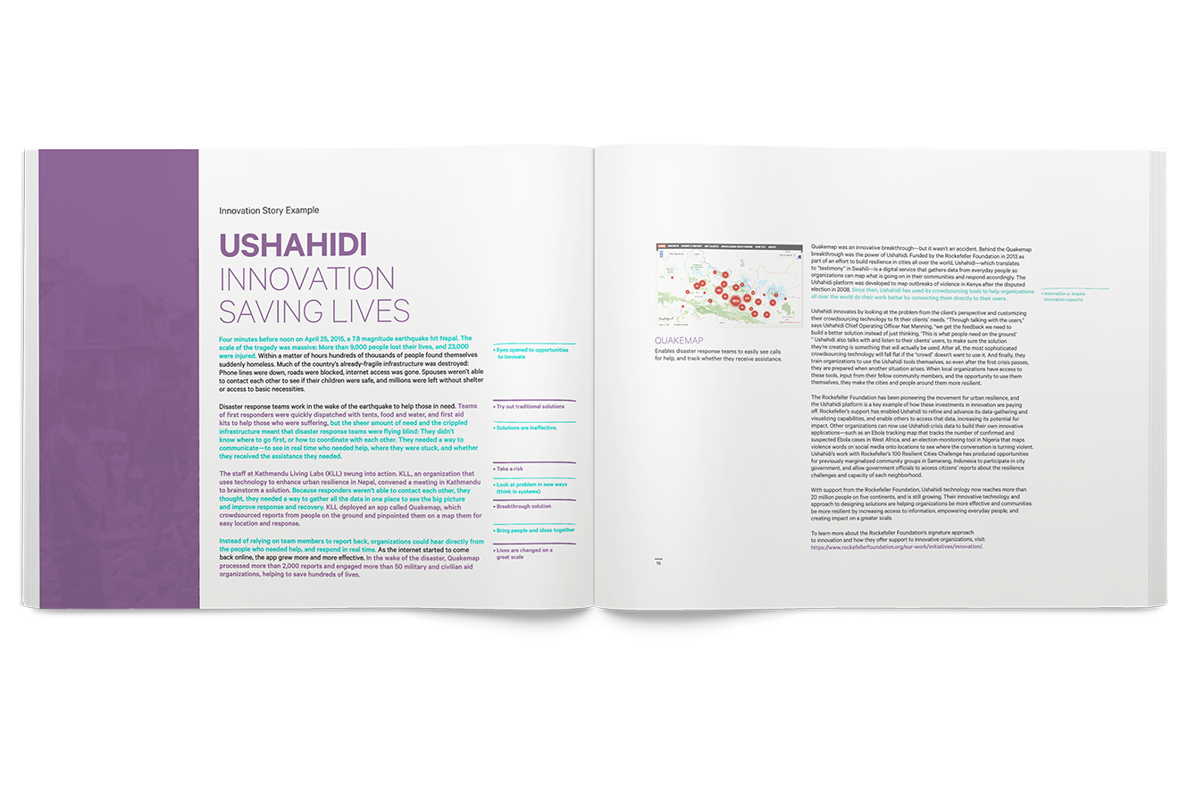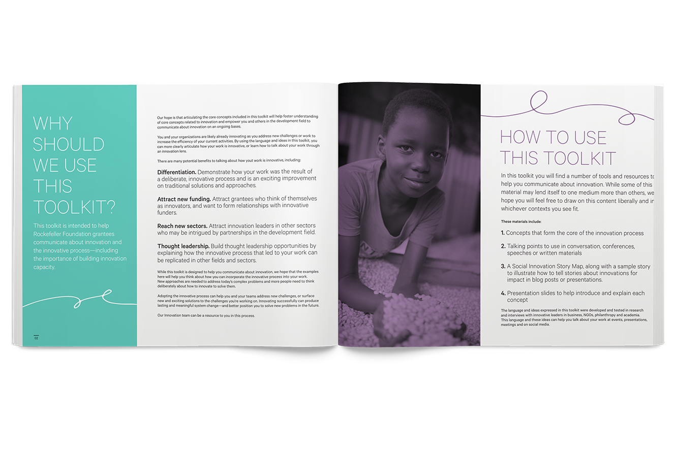 The Rockefeller Foundation works to make a positive change in the world, through they’re Innovation initiative they look to engage leaders in business, science, technology, politics, and more. We developed a message and communications strategy that helps to drive a new conversation about how Rockefeller views innovation. In order to align staff and grantees we developed a series of trainings and collateral. As the creative director, I led the creative development of print, video, ted talk style presentation, storytelling framework, and infographics.