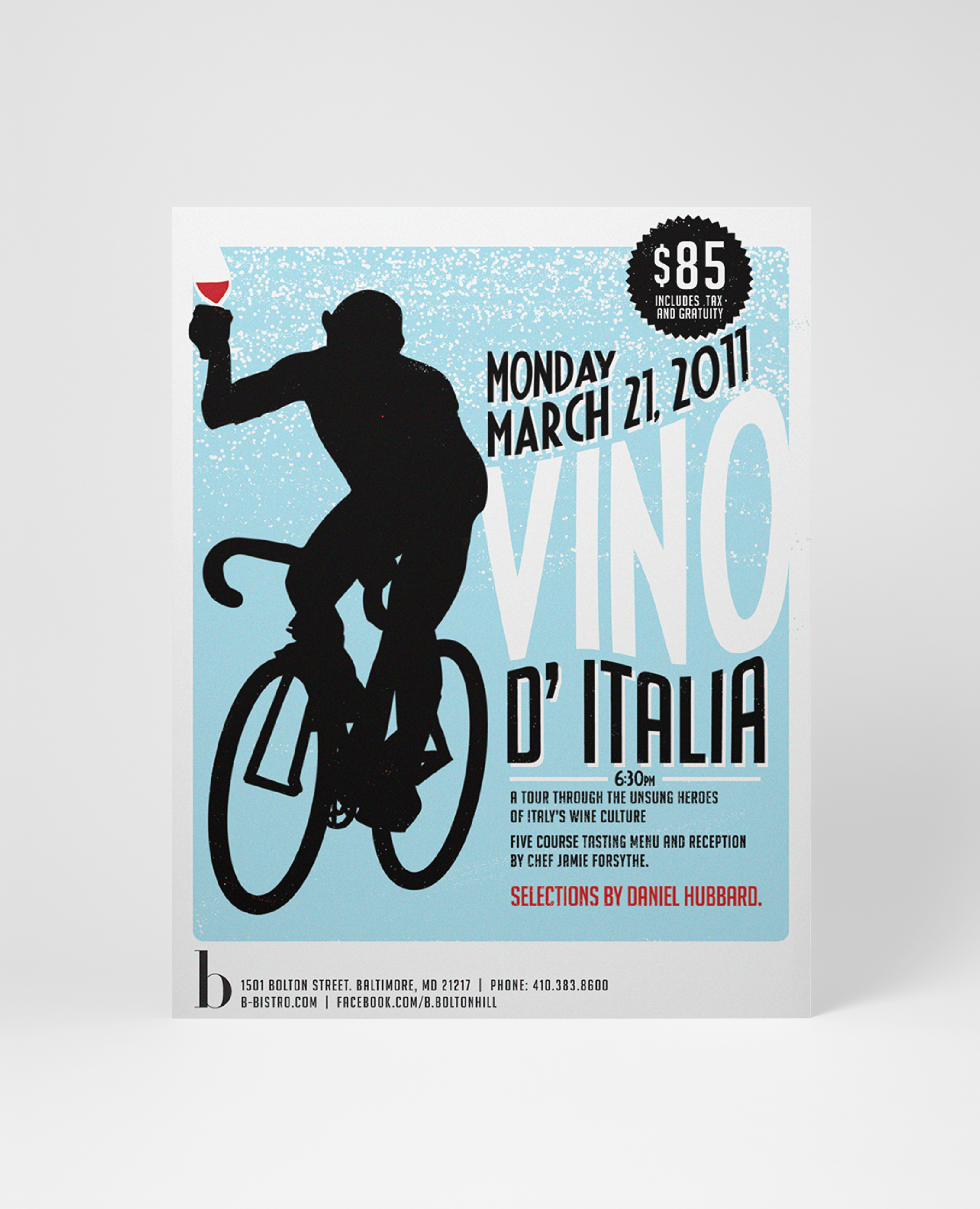 When Domain Select Merchants and B—A Bolton Hill Bistro began partnering on a series of educational wine dinners, I was tasked with developing a series of promotional collateral. I created a silk-screen printed poster for Vino D’Italia that combined hand drawn illustrations and typography inspired by Italian signage.